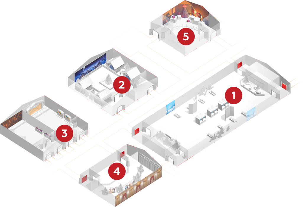 Выставка включала пять тематических павильонов. Исторические декорации погружали гостей в рождественские традиции русской деревни, ярмарки и даже царского дворца.